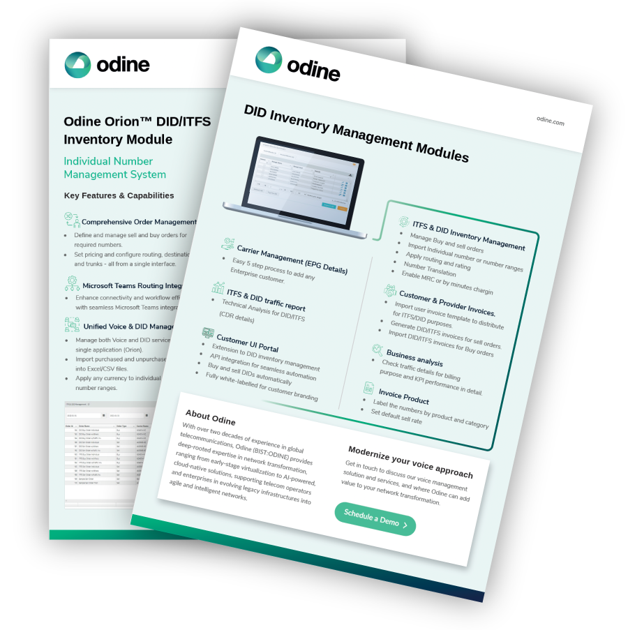 Odine Orion™ DID/ITFS Inventory Module enables seamless management of individual numbers and ranges, from order and routing configuration to real-time inventory tracking. Designed for telecom operators and enterprises, it ensures full visibility, flexible integration, and automated workflows across global number portfolios.